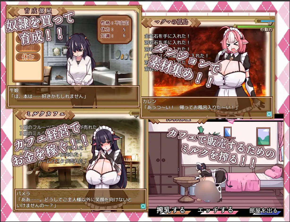 这是一款模拟游戏,您可以管理咖啡馆,在地下城收集材料,饲养奴隶以增加女仆数量,给女仆挤奶,并与她们调情!